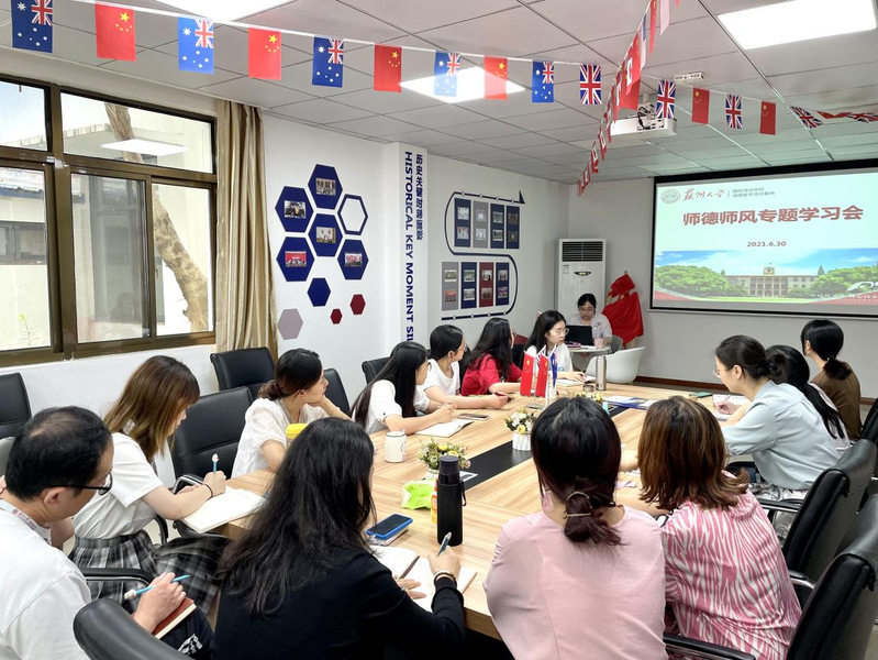 学习会上,丁珏旻带领全体教师共同学习了《苏州大学教师职业道德规范》、《大学师德师风负面清单失信行为处理办法》、《苏州大学继续教育教学工作管理办法》、《苏州大学出国留学项目教学运行指导意见》等规章制度,并列举了发表错误言论、违反教学纪律、学术不端、弄虚作假、谋取私利等师德失范的典型案例,要求全体教师对自己的言行举止要自醒、自律、自觉,不断提高政治站位,严格规范从教从业行为。