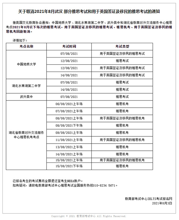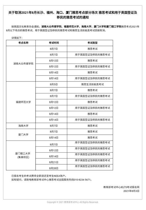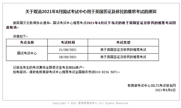 如有疑问:请致电教育部考试中心雅思考试全国服务热线:010-8234 5671或进入官网查询考试实时更新信息:https://ielts.neea.cn/allnews?locale=zh_CN