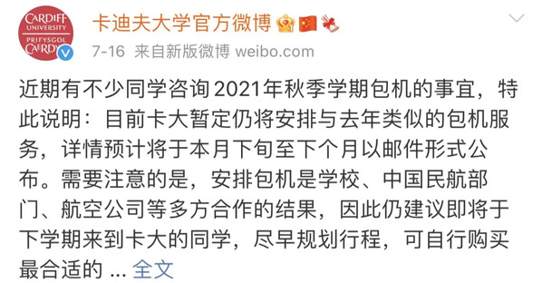 在以上名单中没找到自家学校的童鞋不要着急,说不定在路上了!卡迪夫大学官微也发布了秋季学期包机预告。