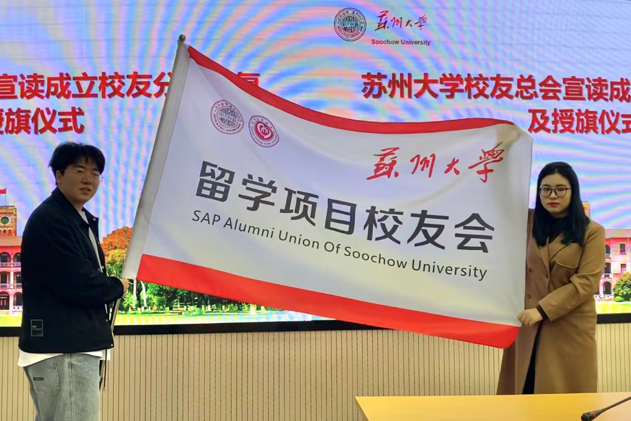 随后,程彦代表苏州大学校友总会宣读了《关于同意成立苏州大学留学项目校友会的批复》并举行了授旗仪式。