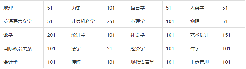 会计、传媒、管理学、人类学、计算机工程、计算机科学、生物化学、创作性写作、生物学、犯罪学、生物医学、生物物理学、舞蹈、生物科技、设计、商务管理、数字媒体、经济学、戏剧研究、地球与大气科学、化学、东亚研究、儿童研究、生态系统管理、教育学、认知系统科学、工程学、希腊研究、历史、环境与健康研究、人类资源管理、环境科学、人类学、欧洲研究、电影、国际商务管理、金融、金融与经济、国际发展研究、美术、运动机能学与健康科学、地理学、语言学、健康法与社会学、法律(JD)、宗教研究、科学、管理科学与技术研究、市场营销、数学、音乐、社会科学、护理、哲学、社会学、物理与天文学、空间工程、空间科学、心理学、统计学、翻译、城市研究、女性研究、视觉艺术。