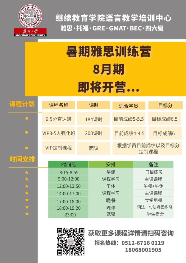 苏州大学继续教育学院语言教学培训中心坐落在美丽的苏大校园内,旨在帮助有学习语言类课程(雅思、托福、GRE、GMAT、BEC、CET等)需求的学员达到其目标分。中心现有师资30余人,其中语言培训专职教师大多拥有海外留学背景及多年语言教学经验,专业性极强,能很好地带领学员适应短平快的培训特点。中心依托于苏州大学,充分利用校内资源设施,配置有雅思UKVI考场、教学楼、图书馆、多功能报告厅、自习室、学生公寓、运动场等。
