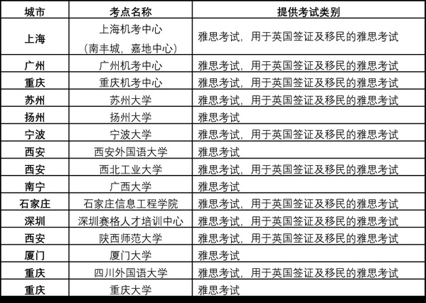 7月已恢复雅思考试的3个机考考点和12个纸笔考试考点继续提供各类雅思考试服务,考点名单及提供的考试类别详见下表: