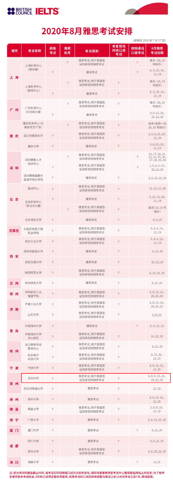 苏州大学的雅思考点8月份的考试时间安排在6、8、9、15、16、20、22和29号