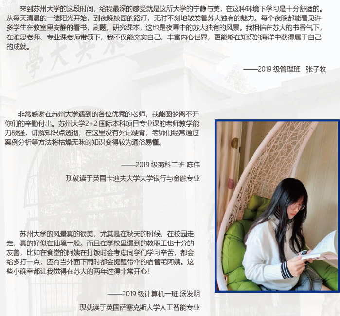 苏州大学是教育部与江苏省人民政府共建“双一流”建设高校,项目在苏州大学校园内办学,学生置身于国内双一流名校的氛围中学习和生活,享受苏大得天独厚的教育资源、教学设施和校园环境。