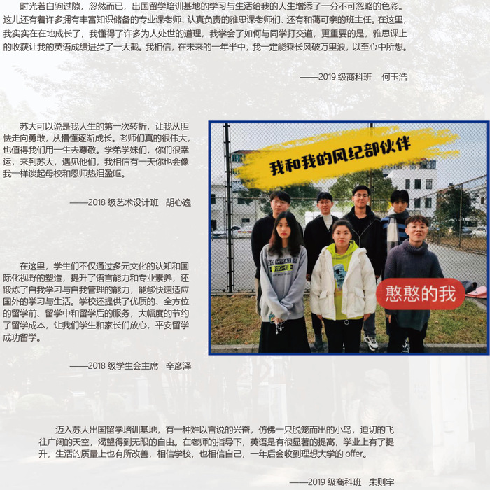 苏州大学国际培训学院负责出国留学培训基地的运营。学院依托苏州大学深厚的历史文化底蕴以及优质的教学资源,为广大有志于出国留学的学生提供全方位出国留学相关服务。学院下设合作交流、招生服务、教务教学、语言教学、学生管理服务、留学指导服务六个中心保障学院的项目运营。