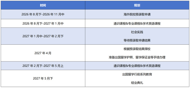 项目配备具有多年行业经验的资深留学指导老师。入学即开展一对一个性化、专业化留学指导服务,入学即制定清晰的学业目标及留学方向;学生、留学指导老师、家长建立微信群全程服务,留学指导团队全程跟踪学业过程;成功升学后,留学指导老师继续服务,关注项目学生境外学习情况并提供硕士申请服务。