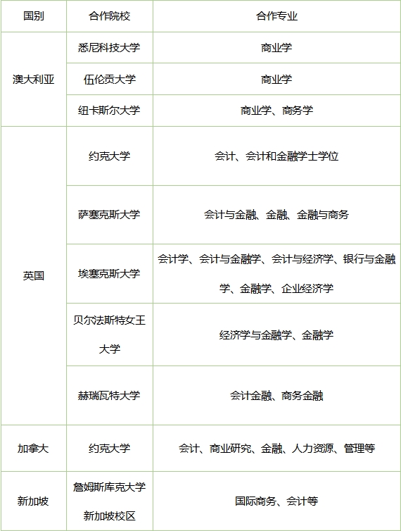 商科方向专项班海外合作专业:会计、商务分析、商务信息系统、金融、商业经济学、国际商务、