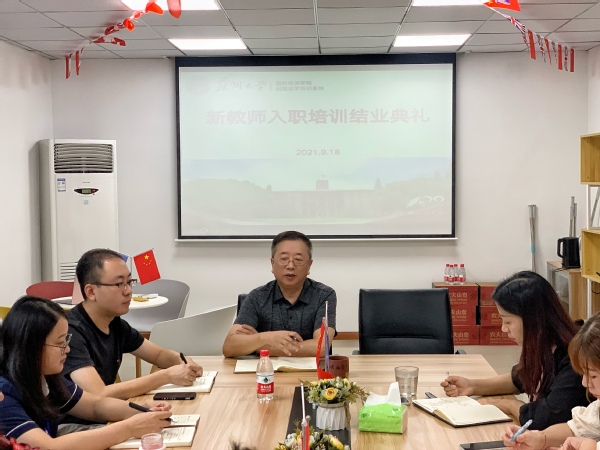9月18日上午,苏州大学国际培训学院新教师入职培训结业典礼在天赐庄校区(北区)5号楼103会议室举行。苏州大学国际培训学院常务副院长胡龙华、继续教育处留学项目科相关负责人及全体新入职教师出席了本次典礼。典礼由留学项目科科长程波主持。