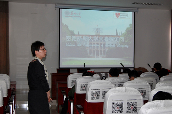 Middlesex 校方代表高雅雯老师、袁许炜老师于2018年3月28日14:30抵达苏州大学,高雅雯老师向办公室接待人员简单了解了我校国际部目前正在开展的业务,同时向我处老师介绍了Middlesex的基本情况及可合作的专业及课程。随后国际项目办公室葛露老师带领外方代表游览了苏州大学的校园风景,领略我校教学文化氛围。