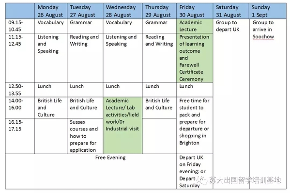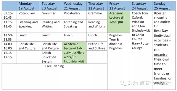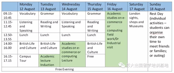 Students to depart Soochow on 9 August Thursday or 10 August Friday, arrive on 10 Friday or 11 August, Saturday, check in Accommodation and rest. There will be 3 weeks of English and combination of Computing or e-commerce academic content which will complete on 30 August, Friday.