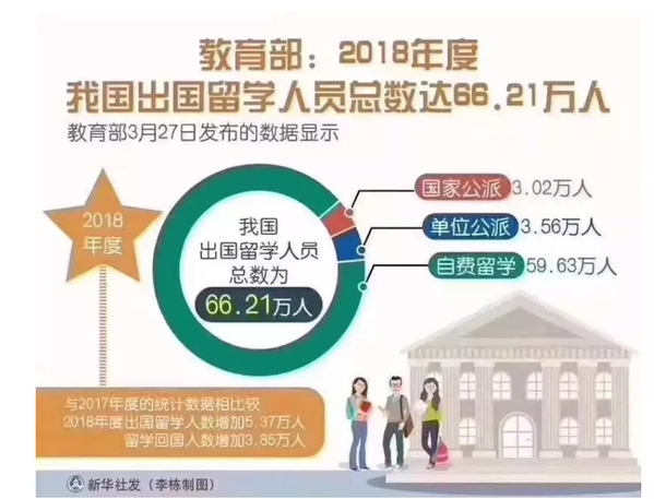 根据新华社3月27日报道,教育部发布的数据显示,2018年度我国出国留学人员总数为66.21万人。其中,国家公派3.02万人,单位公派3.56万人,自费留学59.63万人。