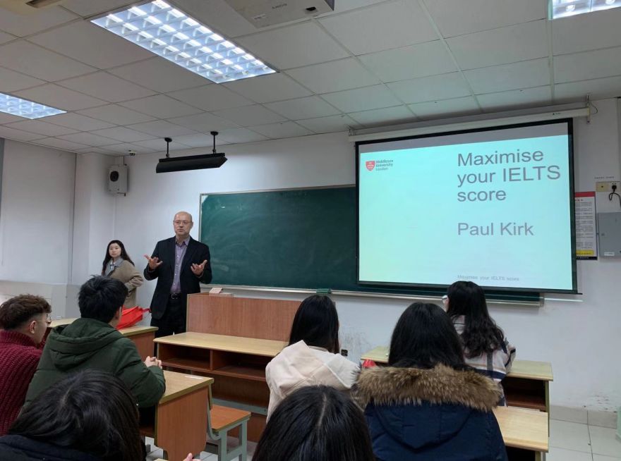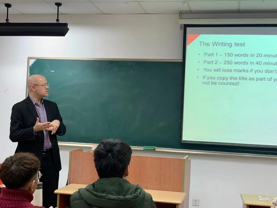 为提升我校出国留学培训基地学习和升学氛围,1月7 日上午,雅思前考官、英国密德萨斯大学语言中心主任Paul Kirk为同学们带来了一场以“Maximise your IELTS score”为主题的讲座,讲座在苏大北校区工科楼举行。