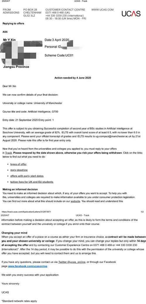 在苏州大学出国留学培训基地2018级学生的结业典礼上,有这么一个男孩被提到:“无论寒冬还是盛夏,无论清晨还是夜晚,都日复一日、持之以恒在工科楼教室埋头苦读,最终以专业课平均分93分,雅思7.0分的优异成绩,收到了世界名校英国曼彻斯特大学的录取通知书……”