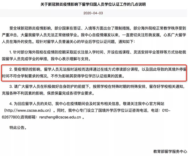教育部国际合作与交流司司长、港澳台办公室主任刘锦表示,教育部此前已发布通知明确,留学人员受疫情影响无法按时返回海外留学所在地的学校而选择通过在线方式来修读部分课程,以及因此出现在境外停留时间不符合学制要求的情况,不作为影响学历学位认证结果的因素。